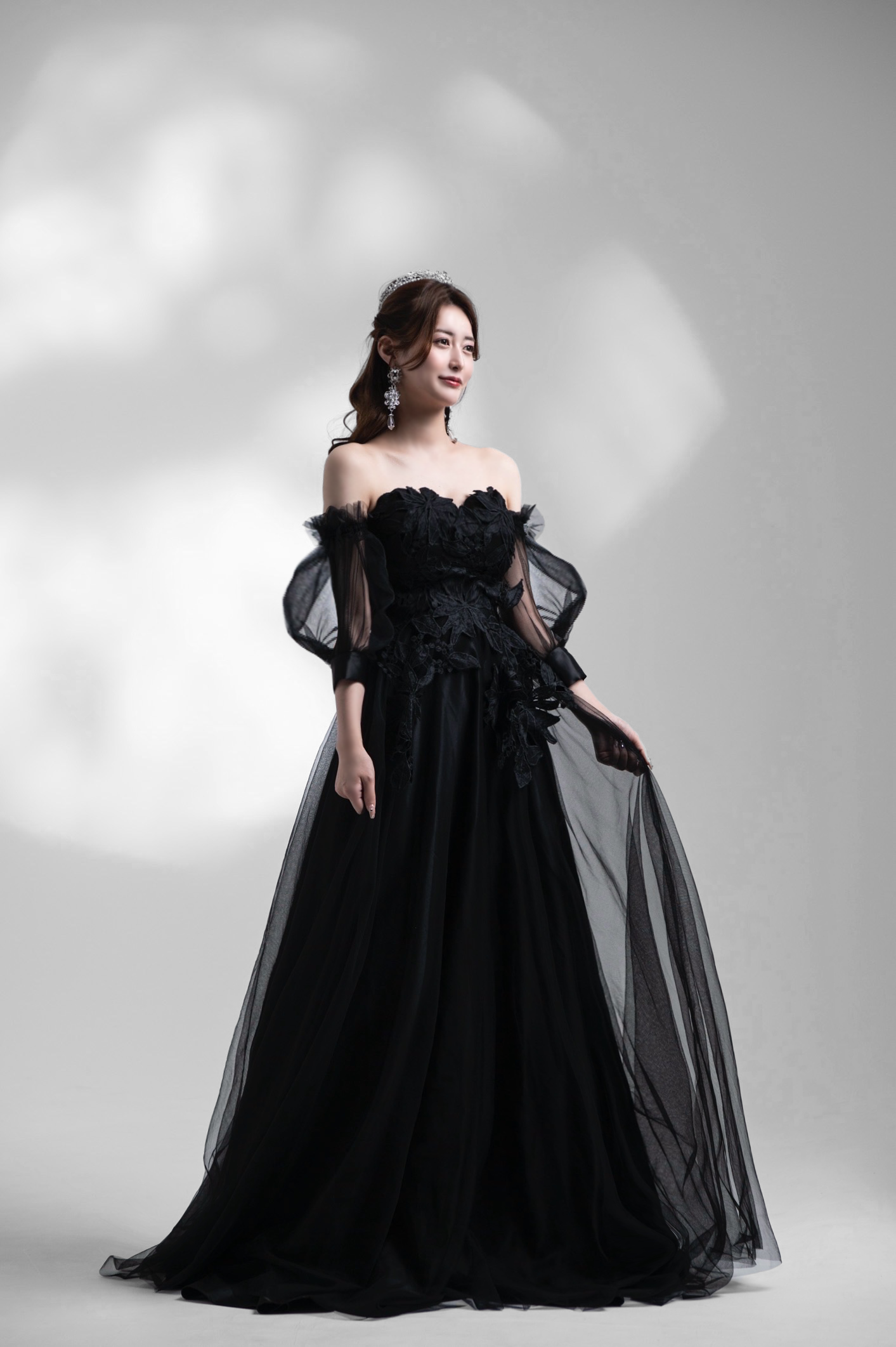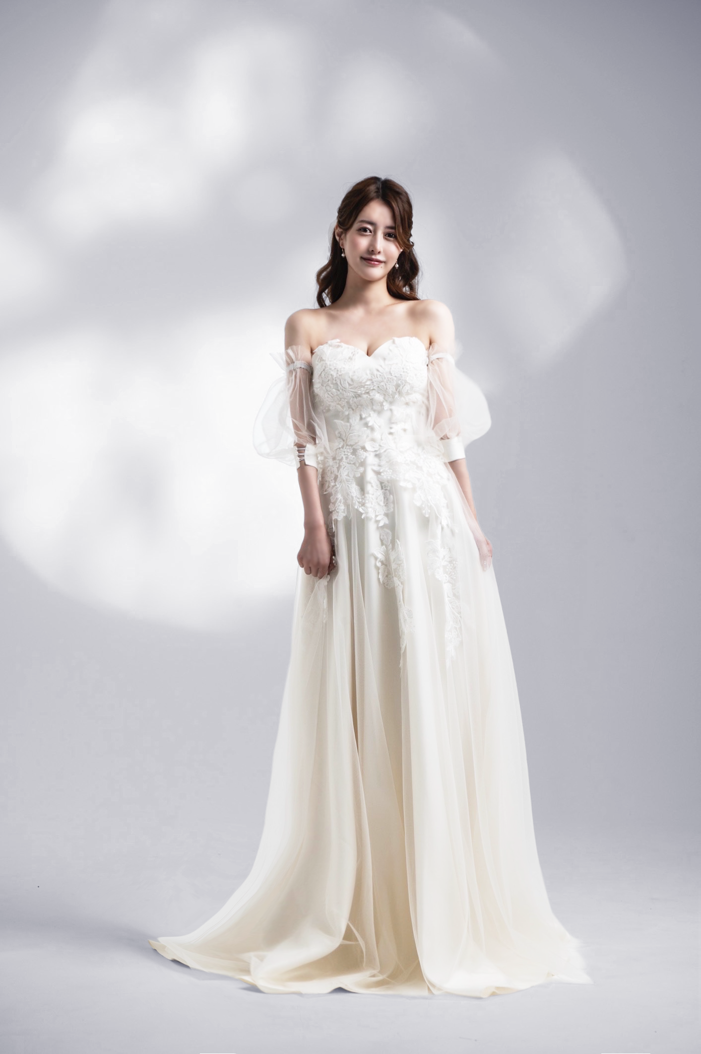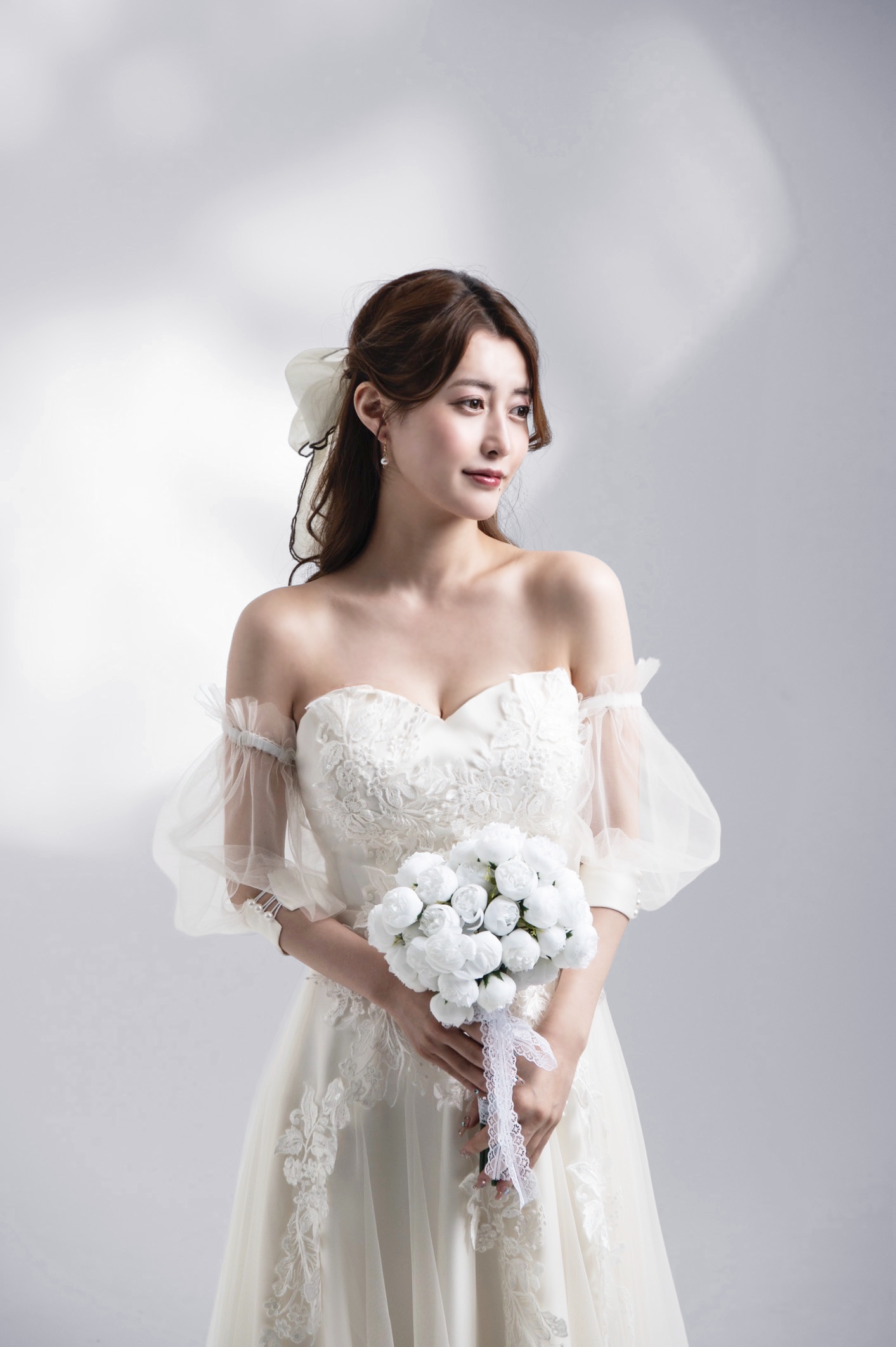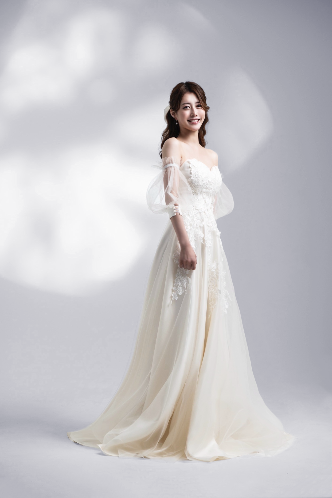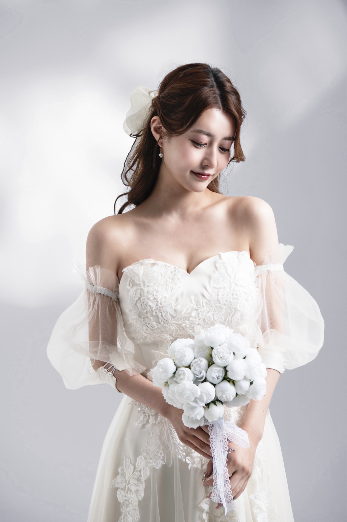 繊細なレースと立体的なフラワーモチーフが浮かぶビスチェに光を透かすチュールスカートがやわらかに広がる幻想的な『Selene』。 取り外し可能なチュールスリーブはクラシカルにもロマンティックにも印象を変えることができ、シーンごとにスタイルをアレンジできます。月の光をまとったような柔らかい透明 感と控えめながら芯のある存在感。前撮り やお色直しに、自分の中の“やさしい強さ” を映すドレスを選びたい方におすすめです。