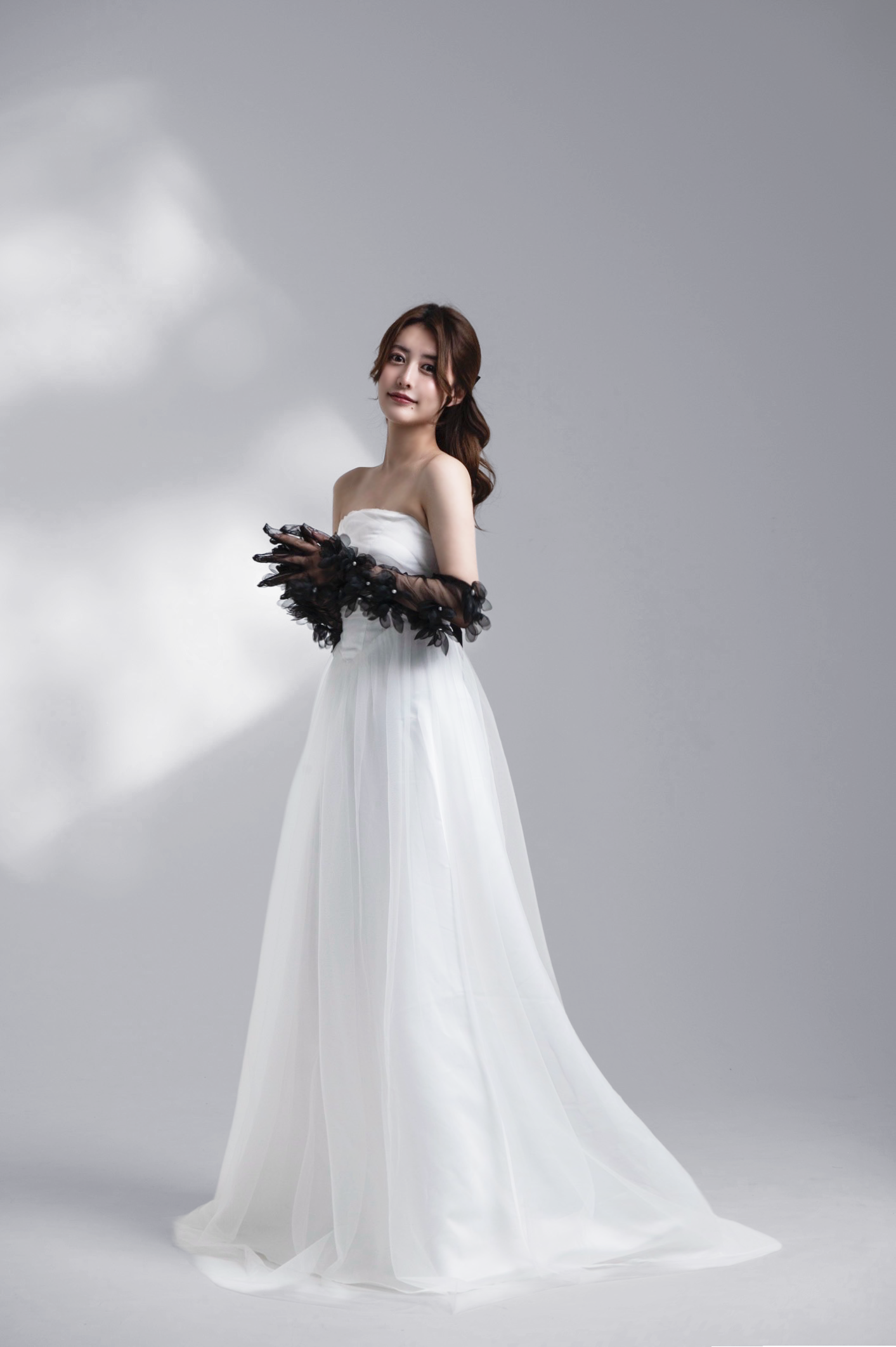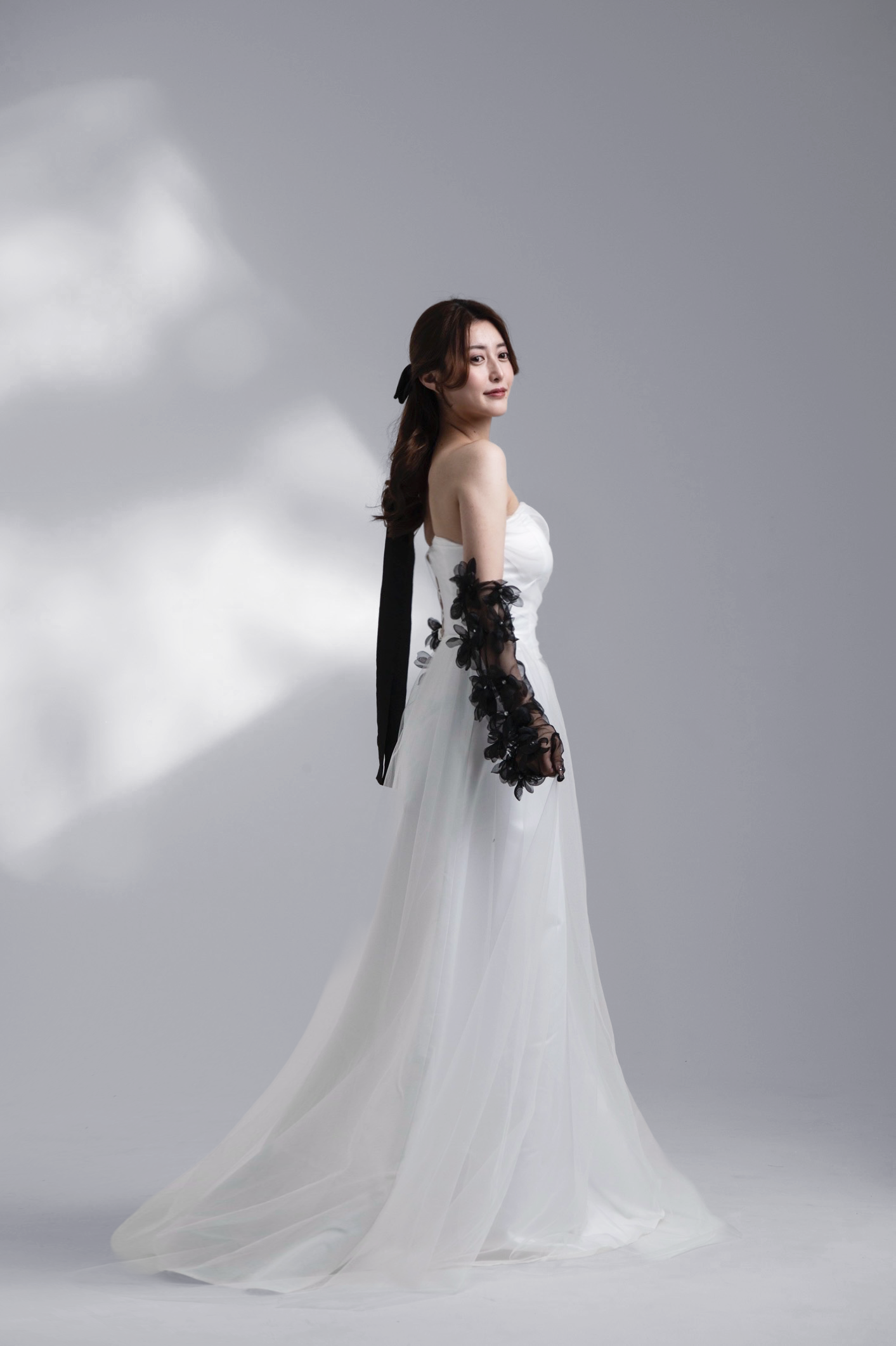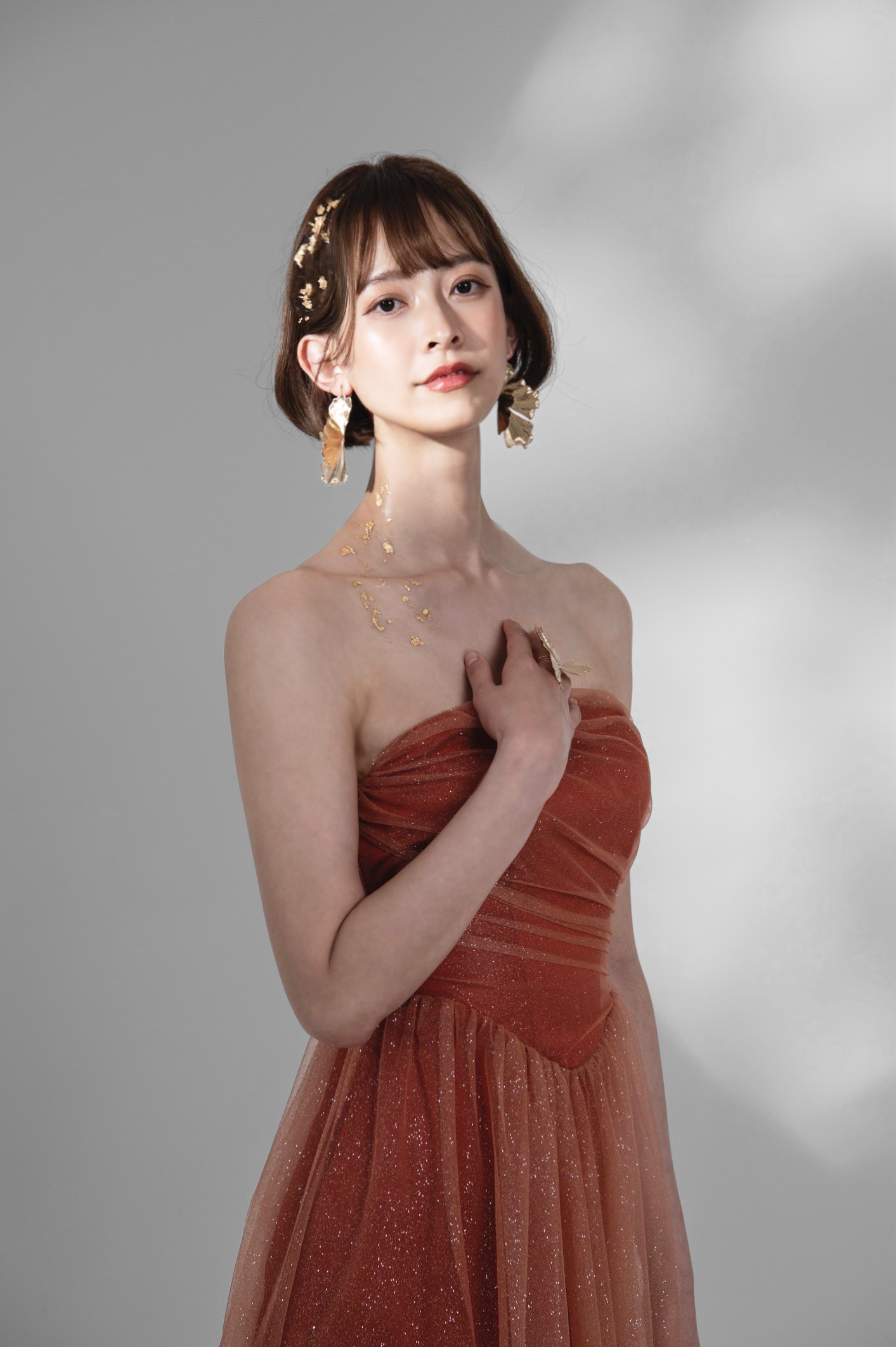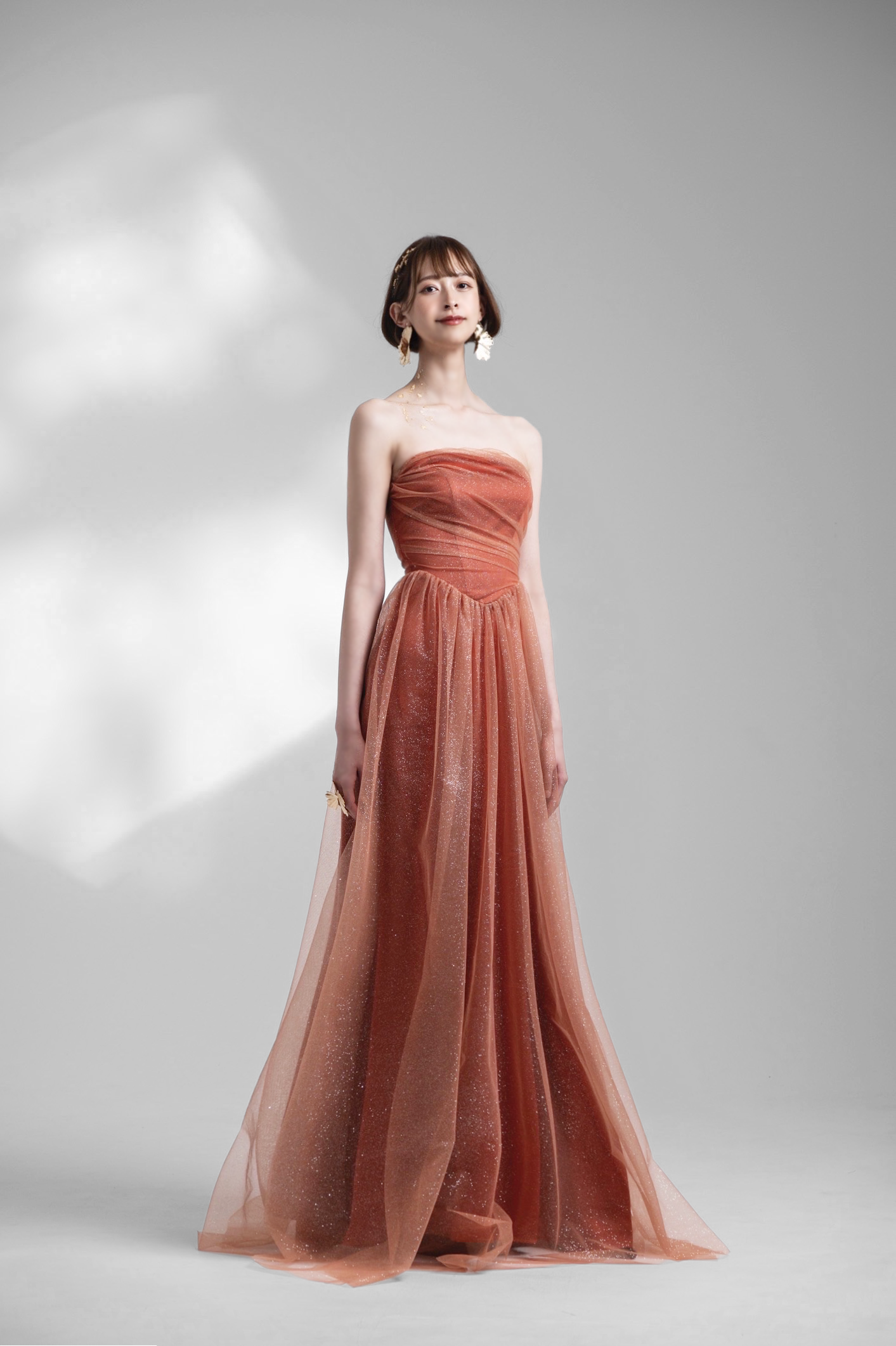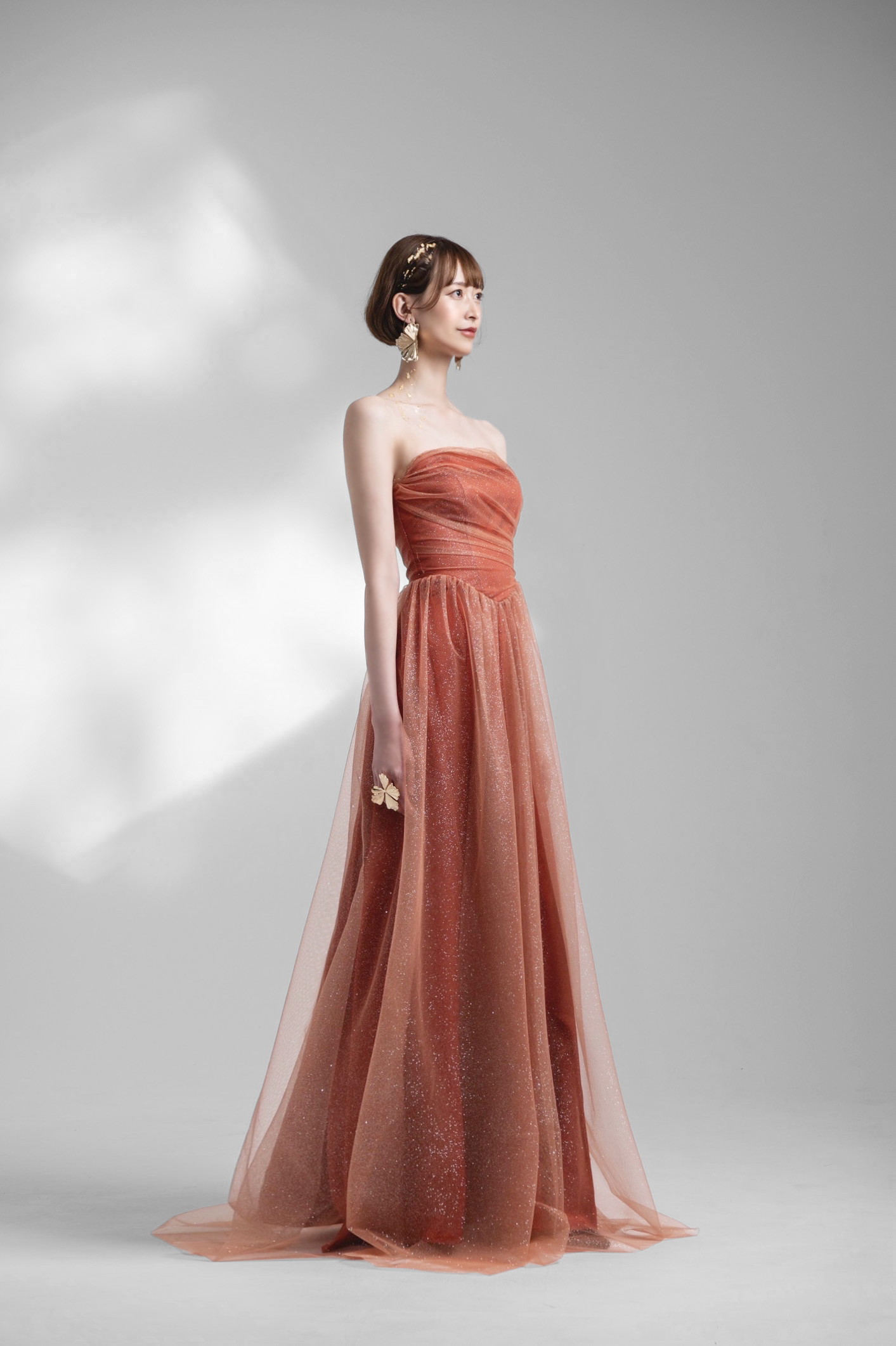 繊細なグリッターチュールを重ねた柔らかく光をまとうようなドレス「Vella」。 チェスのクイーンの駒をイメージして作りました。胸元には立体的なドレープを加え表情豊かなディティールがチャームポイントとなります。ウエストラインはこだわりの曲線でデザインしたのでスタイルを美しく引き立てます。裾にかけて自然に広がるエアリーなAラインが、華やかな存在感を演出します。